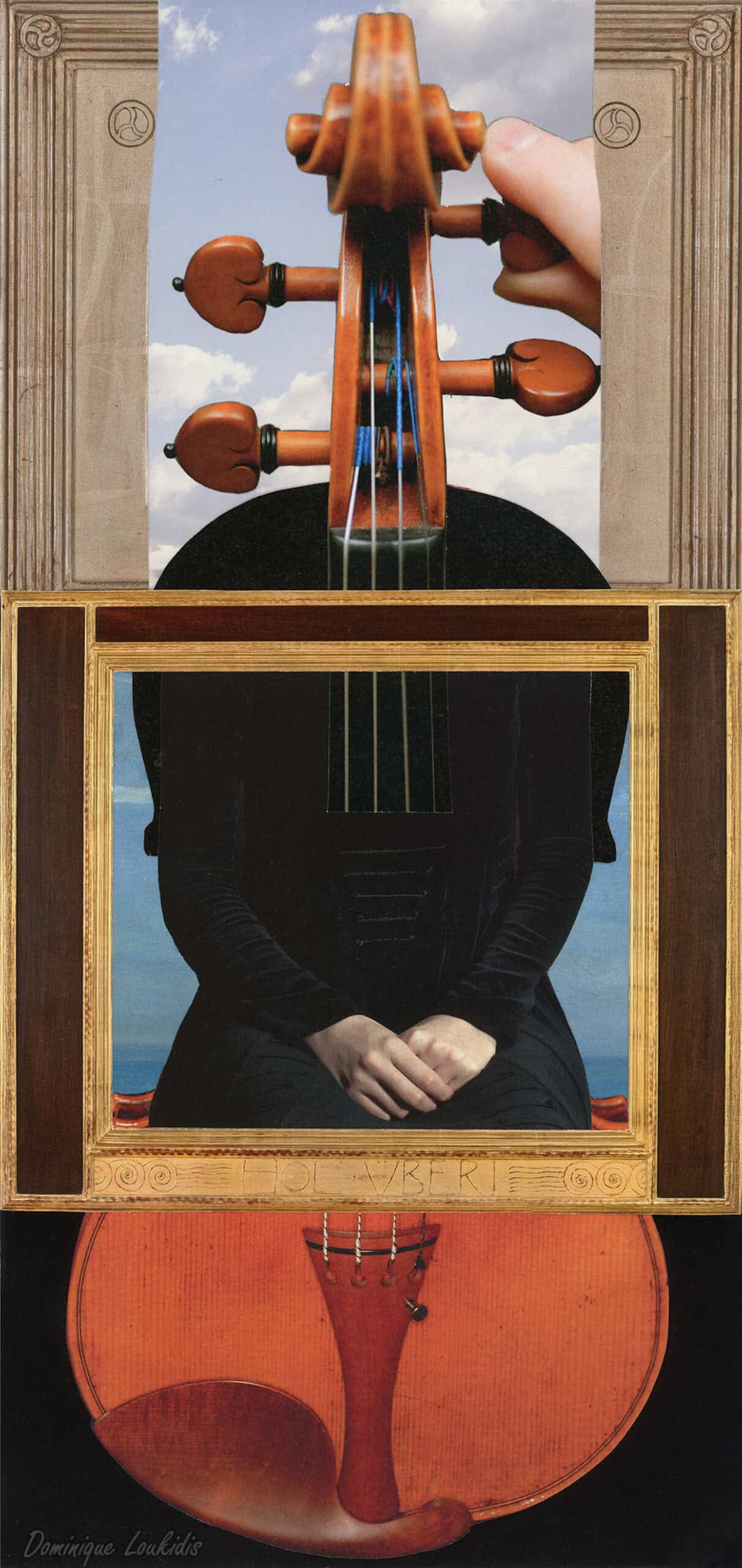 Les influences esthétiques du mouvement surréaliste se ressentent dans ce tableau composé à partir de fragments de violon, de peinture représentant un portrait féminin et d’encadrements. Le tout évoque la symbiose entre l’être humain et la musique dans une composition qui met en avant l’équilibre.